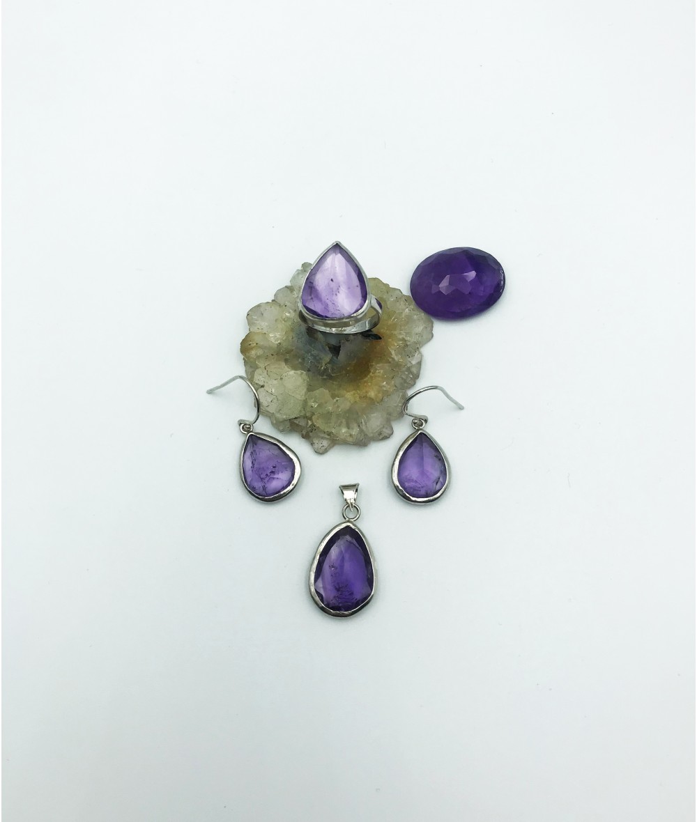 Ametist Taşlı 925 Ayar Gümüş Doğaltaş Bayan Takı Seti-BSR0040TS