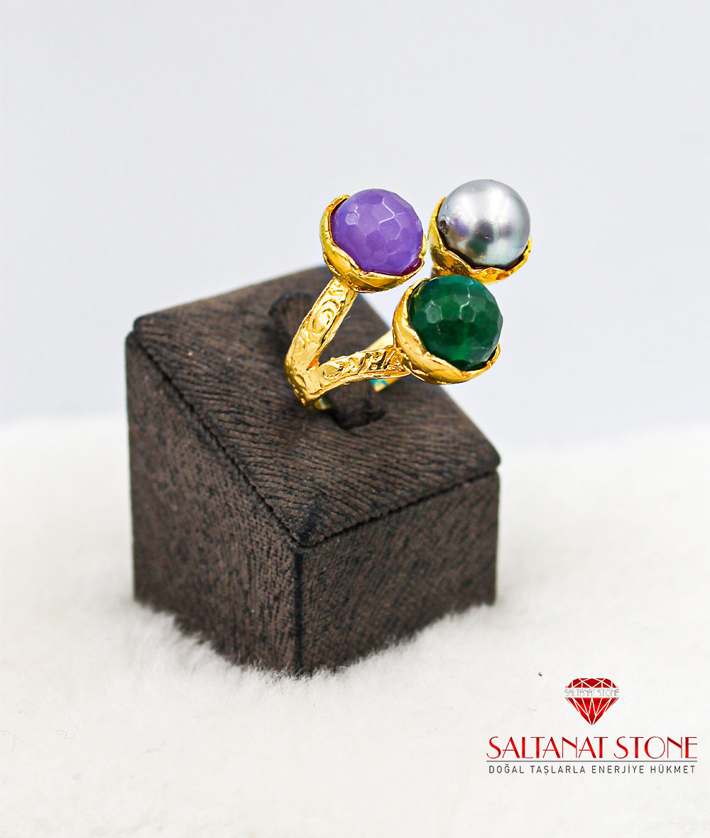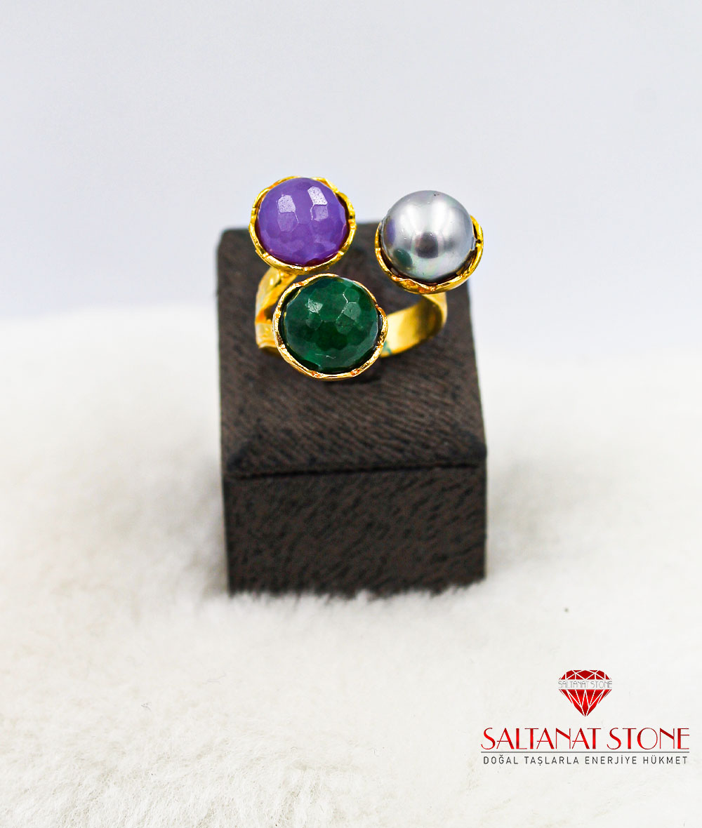 Jade ve Gri Mayorka İnci Taşlı Altın Kaplama Bron Bayan Yüzük - BSV01145BY