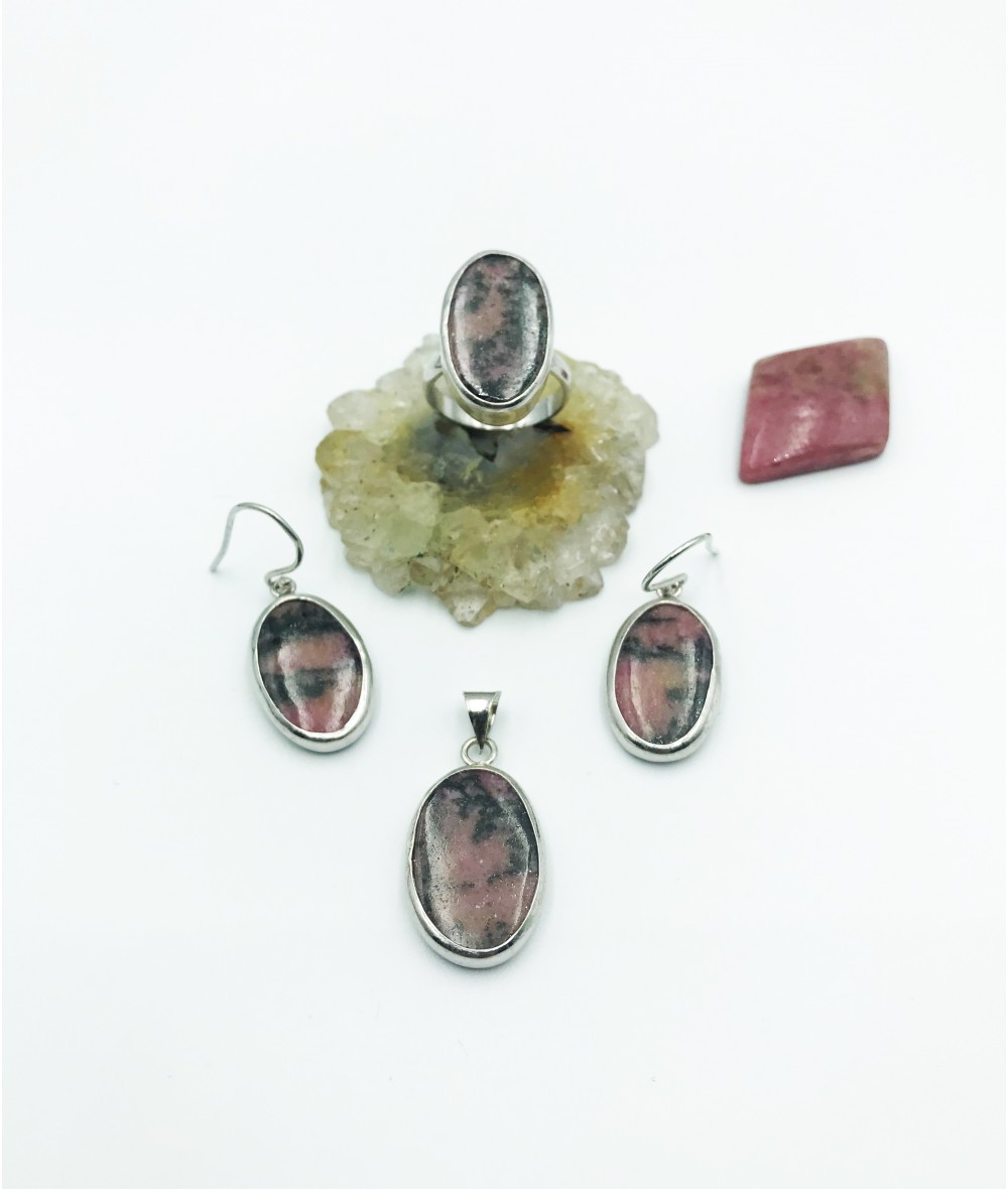 Rodonit Taşlı 925 Ayar Gümüş Doğaltaş Bayan Takı Seti-BSR0016TS